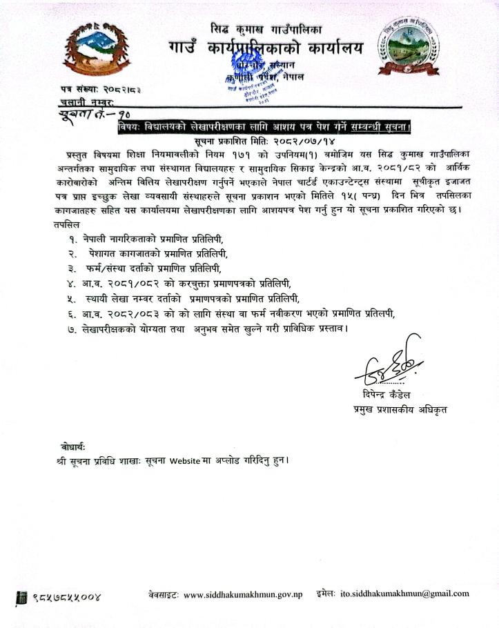 विद्यालयको लेखा परिक्षणको लागि आशय पत्र पेश गर्ने सम्वन्धि सूचना ।