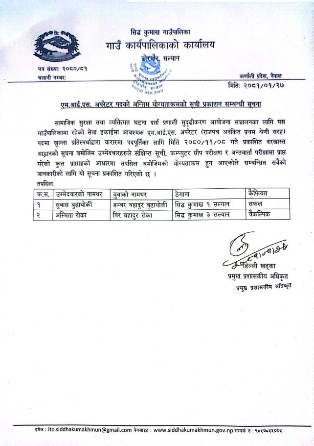 एम.आई.एस. अपरेटर पदको अन्तिम नतिजा प्रकाशन सम्बन्धि सूचना ।