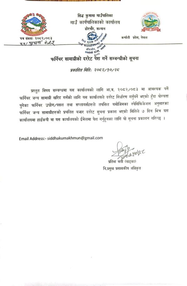 फर्निचर सामग्रीको दररेट पेश गर्ने सम्वन्धि सूचना ।