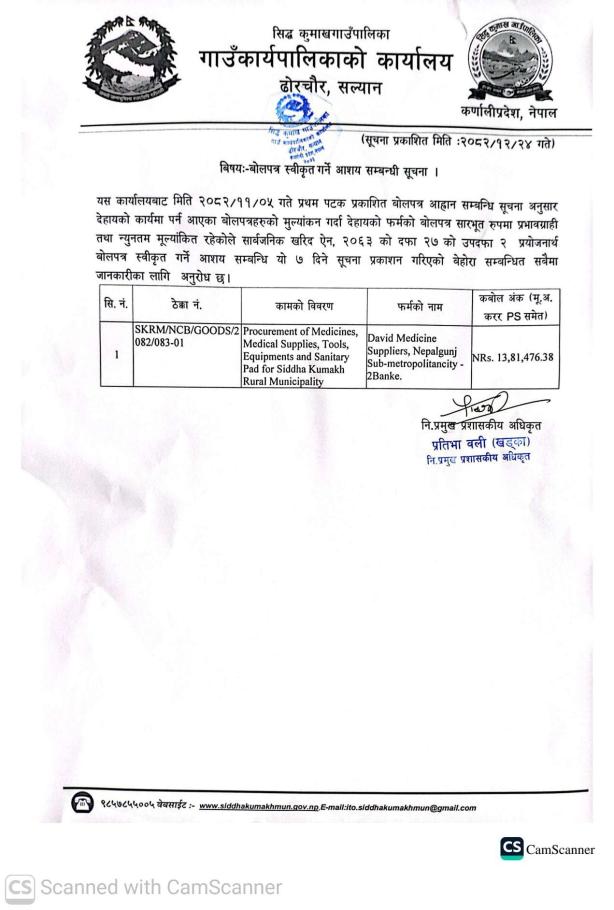 बोलपत्र स्वीकृत गर्ने आशय सम्बन्धि सूचना ।
