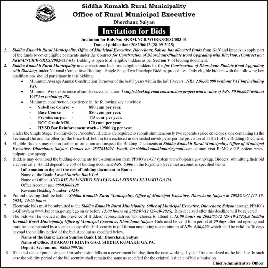 Invitation for Bids (ढोरचौर-फलाटे सडक स्तरोन्नती तथा कालोपत्रे आयोजना ठेक्का सम्वन्धी सूचना )